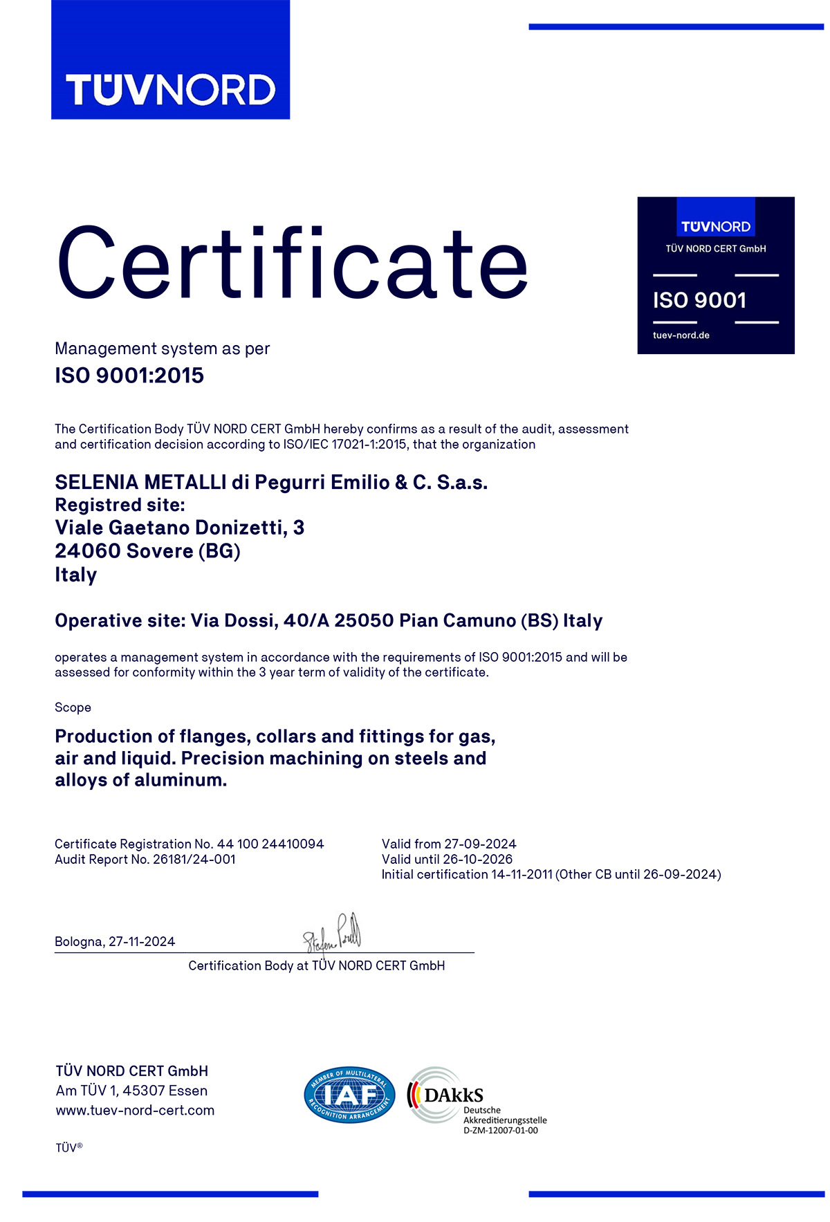 The main aspect of Selenia Metalli's production process is the quality of its bungs, neck rings and nuts. That's why we are certified ISO 9001 - 2015.
